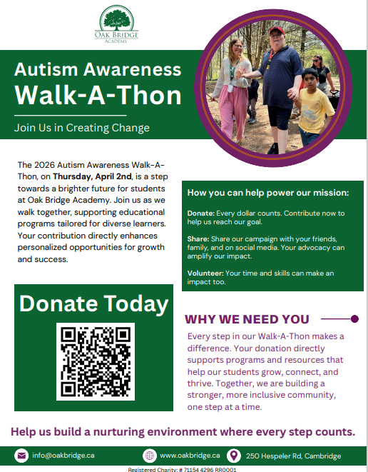 The 2026 Autism Awareness Walk-A-Thon, on Thursday, April 2nd, is a step towards a brighter future for students at Oak Bridge Academy. Join us as we walk together, supporting educational programs tailored for diverse learners. Your contribution directly enhances personalized opportunities for growth and success.