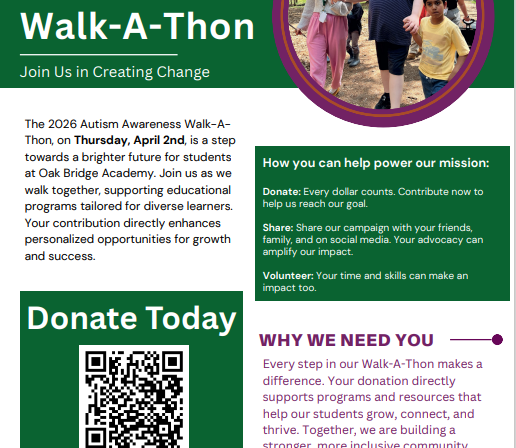 Oak Bridge Academy. The 2026 Autism Awareness Walk-A-Thon, on Thursday, April 2nd, is a step towards a brighter future for students at Oak Bridge Academy. Join us as we walk together, supporting educational programs tailored for diverse learners.